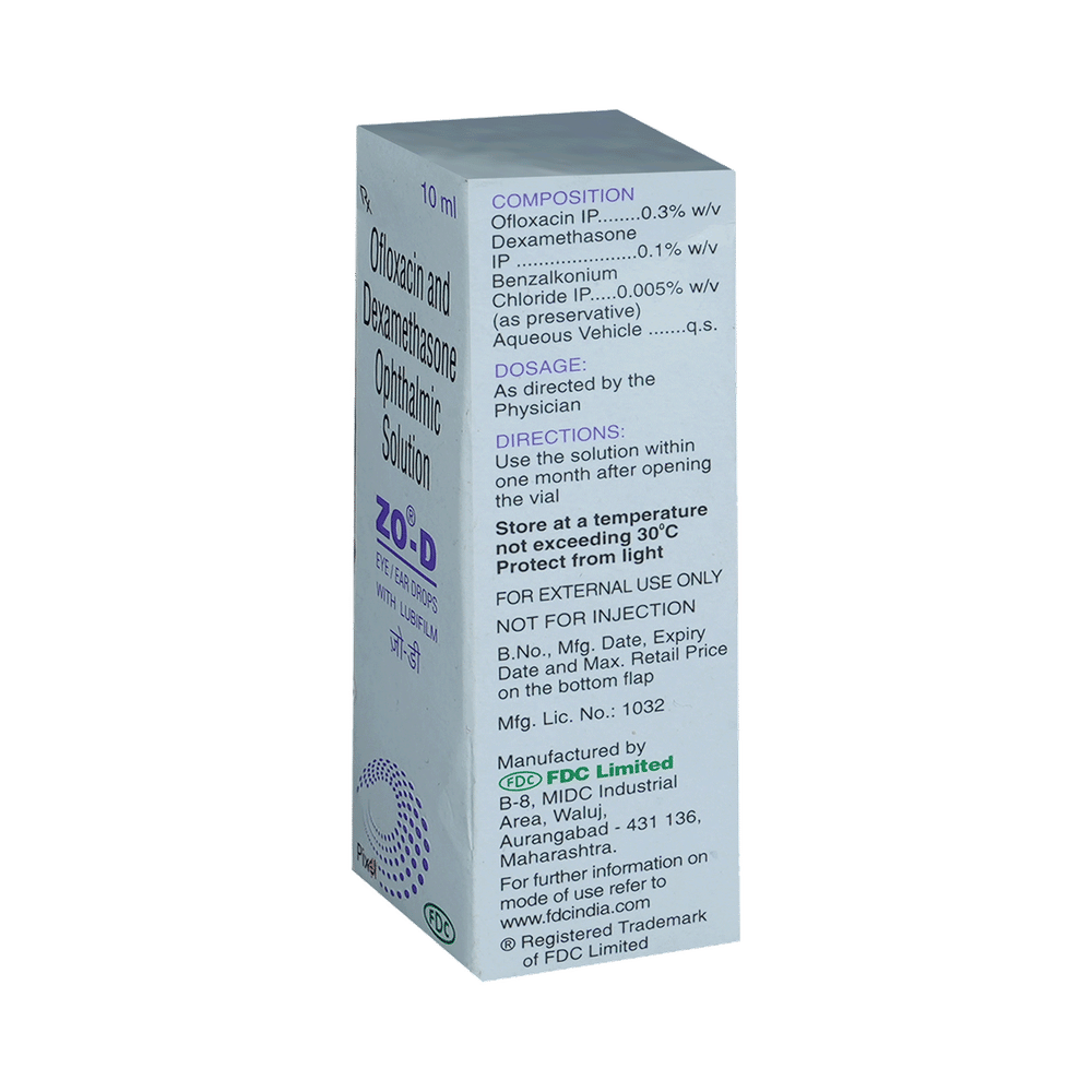ZO-D Eye Drop is a prescription medicine used in the treatment of bacterial infections of the eye. It stops the growth of bacteria and helps in relieving redness, itching, and swelling. This way it treats the infection relieves your symptoms. ZO-D Eye Drop is to be used only in the affected eye in the dose and duration as advised by the doctor. Wash your hands before using this medicine. It is advised to check the label for directions before use. Do not skip any doses and finish the full course of treatment even if you feel better. Stopping the medicine too early may lead to the infection returning or worsening.The most common side effects include discomfort and irritation at the application site. If these side effects persist for a longer duration, inform your doctor. In case by accident, this medicine goes into your ears, nose, or mouth, immediately rinse it off with water. Inform your doctor if you are allergic to any of the ingredients of this medicine or taking any other medication. It is advised not to drive or operate heavy machinery after using this medicine as it may cause temporary blurring of vision.
