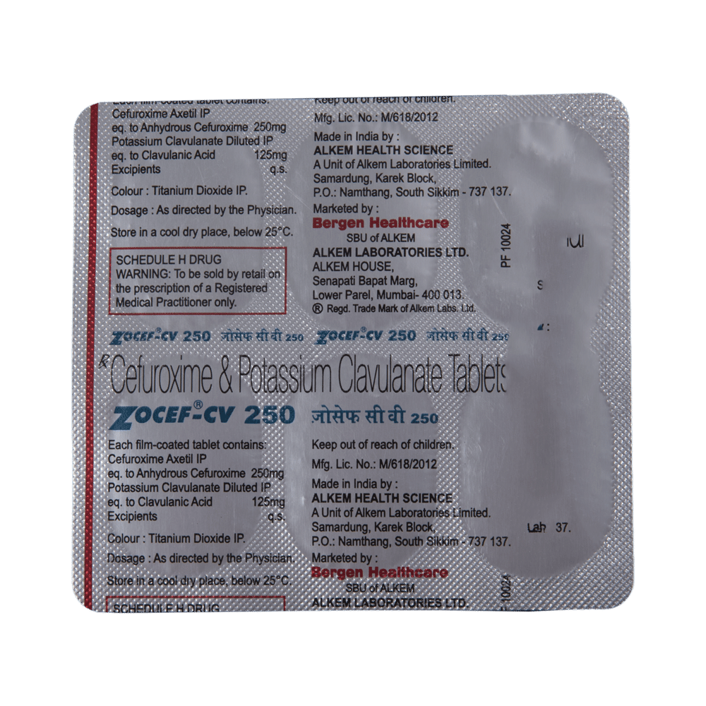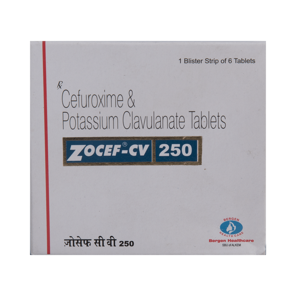 Zocef-CV 250 Tablet is a combination medicine that is used to treat various types of bacterial infections. It fights against the microorganisms to prevent their growth and further spread of the infection. Zocef-CV 250 Tablet is a prescription medicine. It is advised to take it as per the prescription. It can be taken with or without food, but it must be taken at a fixed time to ensure better efficacy. Do not consume more than the recommended dose, as this may have harmful effects on your body. If you miss a dose, take it as soon as you remember. The course of the treatment must be completed even if you feel better. Sudden discontinuation of the treatment may affect the potency of the medicine.Some common side effects of this medicine include nausea, vomiting, diarrhea, indigestion, and abdominal pain. If any of the side effects get aggravated, you must consult your doctor immediately. If you experience any allergic reaction (rashes, itching, swelling, shortness of breath, etc.), you must seek immediate medical help.Before taking this medicine, you should tell your doctor if you are taking any medicines for any health condition. Pregnant or breastfeeding women should also consult with their doctor before taking it. Avoid drinking alcohol as it can cause excessive drowsiness with this medicine. It usually does not impair your ability to drive, but you should not drive if it makes you feel sleepy or dizzy. You must take adequate rest for a faster recovery, also take a healthy diet and drink plenty of water. Your doctor may ask for a few laboratory and diagnostic tests to know the effects of the medicine on your body.
