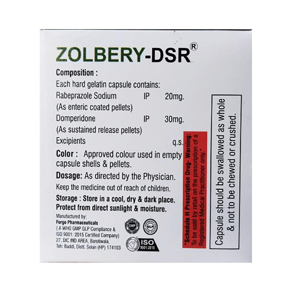 Zolbery-DSR Capsule is a combination medicine used to treat gastroesophageal reflux disease (acid reflux). It works by relieving the symptoms of acidity such as heartburn, stomach pain, or irritation. It also neutralizes the acid and promotes easy passage of gas to reduce stomach discomfort. Zolbery-DSR Capsule is taken without food in a dose and duration as advised by the doctor. The dose you are given will depend on your condition and how you respond to the medicine. You should keep taking this medicine for as long as your doctor recommends. If you stop treatment too early your symptoms may come back and your condition may worsen. Let your healthcare team know about all other medications you are taking as some may affect, or be affected by this medicine.The most common side effects are diarrhea, stomach pain, dryness in the mouth, headache, flatulence, and weakness. Most of these are temporary and usually resolve with time. Contact your doctor straight away if you are at all concerned about any of these side effects. This medicine may cause dizziness and sleepiness, so do not drive or do anything that requires mental focus until you know how this medicine affects you. Avoid drinking alcohol while taking this medicine as it can worsen your sleepiness. Lifestyle modifications like having cold milk and avoiding hot tea, coffee, spicy food or chocolate can help you to get better results.Before you start taking this medicine it is important to inform your doctor if you are suffering from kidney or liver disease. You should also tell your doctor if you are pregnant, planning pregnancy or breastfeeding.