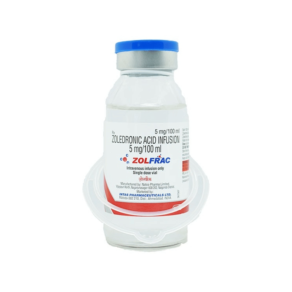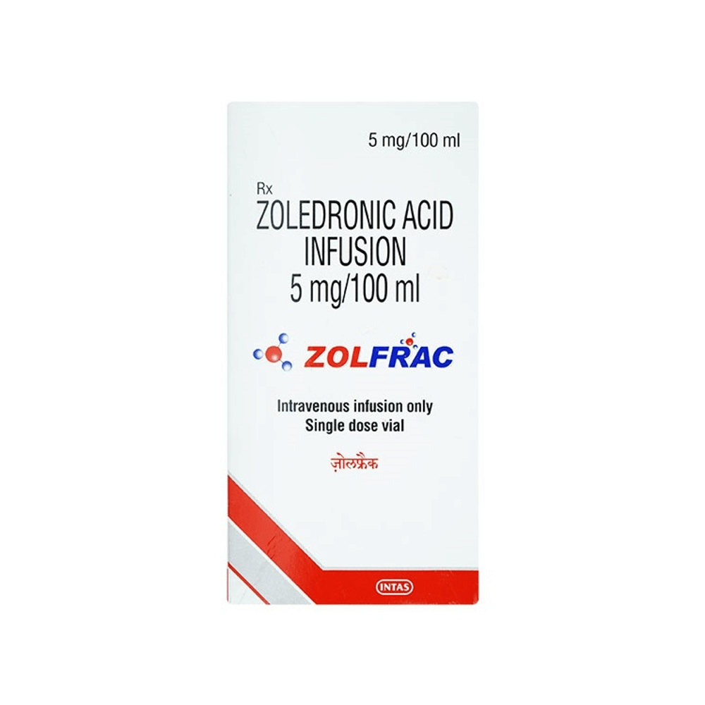 Zolfrac 5mg/100ml Injection is used to treat or prevent weakening of the bones (osteoporosis) caused by menopause or use of steroids. Using this medicine can reduce your risk of breaking bones. It is also used to treat high levels of calcium in people who have cancer. Zolfrac 5mg/100ml Injection is given by a doctor or nurse. How much you are given, and how often, will be decided by your doctor. It may just be a single injection or you may need regular injections depending upon your underlying condition. Your doctor will ask you to drink plenty of water before the injection, to avoid getting dehydrated. It may take several days to get the full benefit of this drug. Zolfrac 5mg/100ml Injection is only part of a treatment program that may also include changes to your diet and taking calcium and vitamin supplements.The most common side effects include nausea, fatigue, anemia, bone pain, fever, and vomiting. Zolfrac 5mg/100ml Injection can cause serious kidney problems, especially if you are dehydrated, if you take diuretic medicine (water pills) or if you already have kidney disease. It can also cause low levels of calcium in the blood and pain in the mouth or jaw. These are serious side effects and need urgent medical attention. Tell your doctor straight away if you notice any of these.You should not be given this medicine if you are pregnant or breastfeeding. Before taking it, tell your doctor if you have kidney problems or low calcium levels. Also, let your doctor know what other medicines you are taking. Some of them may affect, or be affected by, this injection, especially medicines used to treat severe infections and medicines used to treat cancer and osteoporosis. You may need frequent medical tests to check your kidney function and calcium levels. Avoid smoking as it can reduce your bone mineral density, making fractures more likely. Drinking large amounts of alcohol can also cause bone loss and should be avoided.