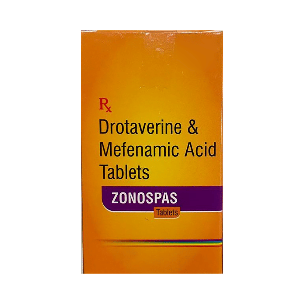 Zonospas Tablet is a combination of two medicines: Drotaverine and Mefenamic Acid, which relieves abdominal pain and cramps. Drotaverine is an anti-spasmodic medicine which relieves contractions (spasms) associated with smooth muscles in the abdomen. Mefenamic Acid is a non-steroidal anti-inflammatory drug (NSAID). It works by blocking the release of certain chemical messengers that cause abdominal pain and inflammation (swelling).