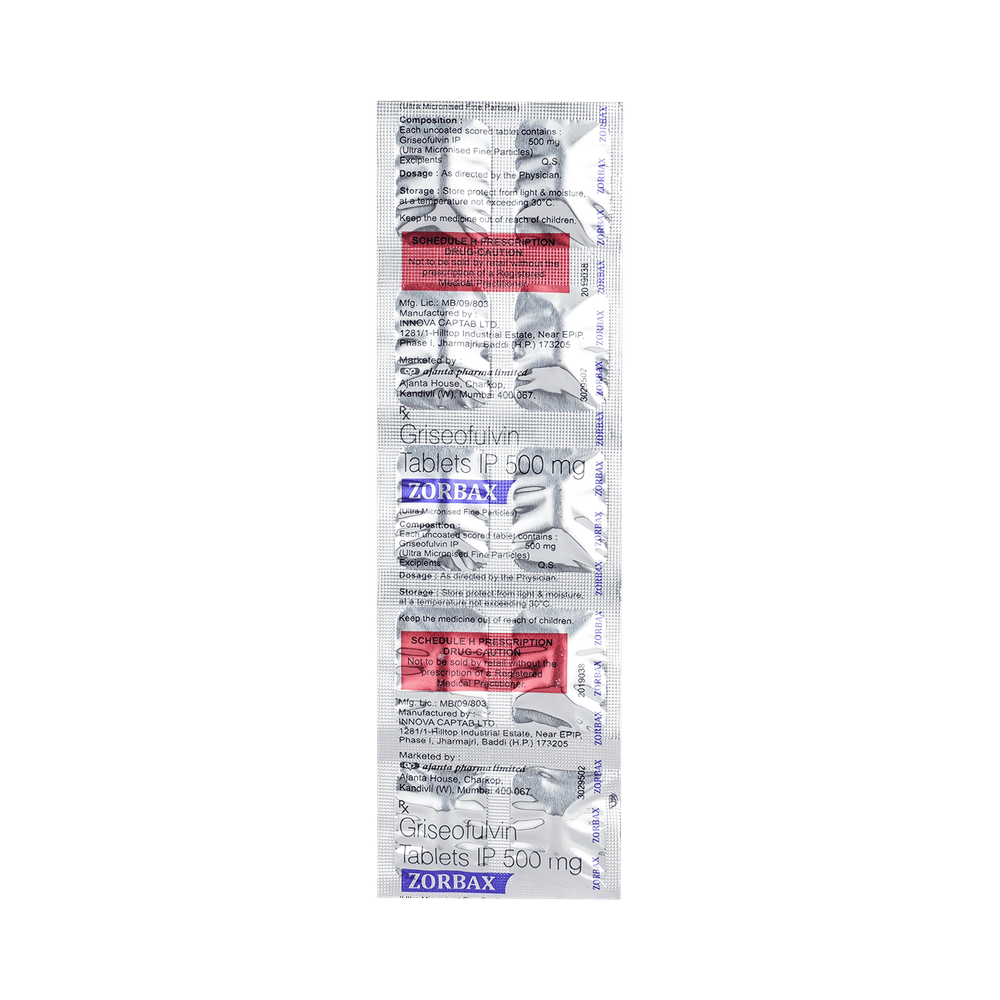 Zorbax 500mg Tablet is used to treat fungal infections of the skin, nails, scalp, or hair. This medicine is usually used when other medicines have failed to clear up the infection or are not appropriate. It kills the fungi and prevents them from growing on your skin. Zorbax 500mg Tablet should be taken with food. This will help your body to absorb the medicine. Take it regularly and at the same time each day. Follow the doctor's instructions carefully to get the most benefit. You should not stop taking this medicine without consulting your doctor.Some common side effects of this medicine include headache, skin rash, nausea, and diarrhea. If they do not go away or worsen, you should contact your doctor. Some people may also experience dizziness, you should not drive or operate heavy machines if this happens.Before using Zorbax 500mg Tablet, you should tell your doctor if you have any problems with your heart or liver. It may also affect, or be affected by, some other medicines you are taking. So let your doctor know about all the other medicines you are taking to make sure you are safe. Pregnant and breastfeeding mothers should not use this medicine as it can cause harm to the baby. You should also avoid drinking alcohol while you are taking this medicine.