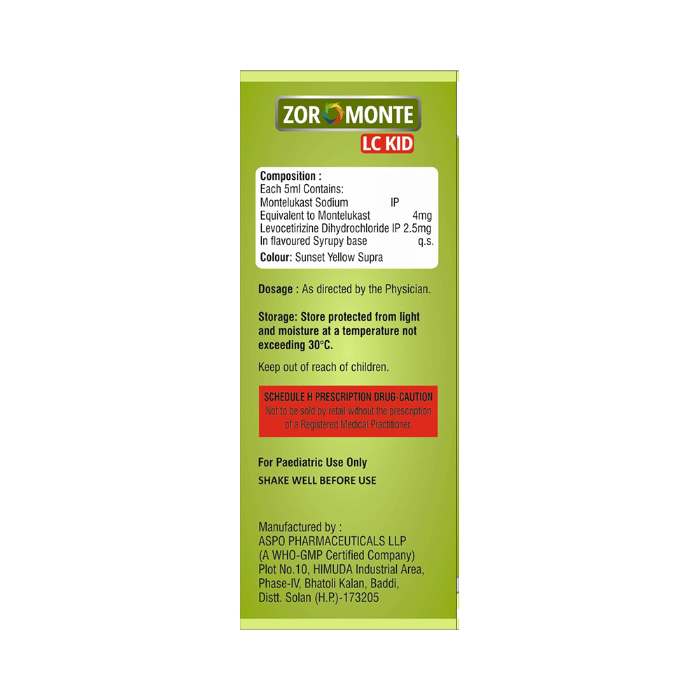 Zoromonte LC Kid Syrup is commonly prescribed in children to treat symptoms of allergy such as runny nose, sneezing, itching, swelling, congestion, and watery eyes. It may also help in the treatment of asthma and skin allergies. Give this medicine to your child at a fixed time before or after food in the prescribed dose, time, and way. For asthma, prefer giving Zoromonte LC Kid Syrup in the evening or 2 hours before physical activity. For allergy, it is best to give it either in the morning or in the evening, depending upon the time of onset of symptoms. In case your child has both, prefer giving it in the evening. If your child vomits within 30 minutes of taking this medicine, give the same dose again, but skip it if it’s already time for the next dose.Your child may start to feel better after a few regular doses. However, you must still complete the prescribed dose to ensure maximum benefit. Moreover, stopping the medicine abruptly may worsen your child’s condition. This medicine may cause some minor and temporary side effects like vomiting, diarrhea, nausea, dizziness, dry mouth, rash, and headache. Usually, these episodes subside once your child’s body adapts to the medicine. However, in case these effects persist or start bothering your child, consult your child’s doctor without any delay.Let your child’s doctor know if your child is already taking any medicines. Also, narrate your child’s complete medical history, including any prior episodes of allergy, heart problem, blood disorder, vascular disorders, birth defects, airway obstruction, lung anomaly, skin disorder, liver impairment, and kidney malfunction. This information is critical for dose alterations and in planning your child’s overall treatment.