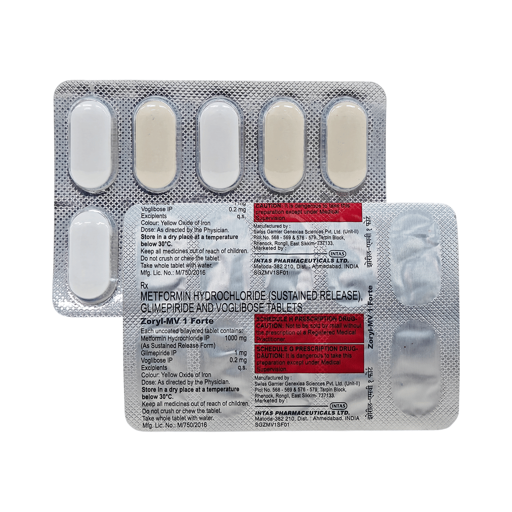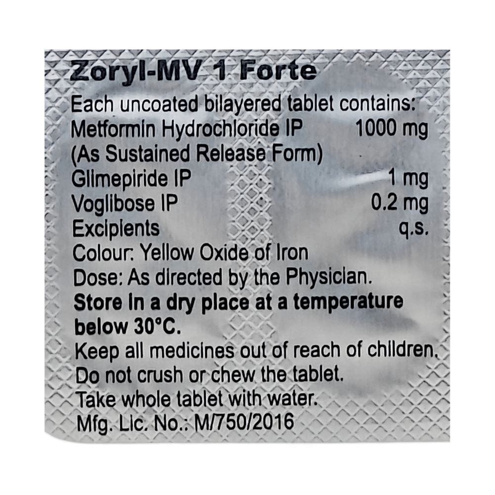 Zoryl MV Forte 1mg/1000mg/0.2mg Tablet belongs to a category of medicines known as anti-diabetic drugs. It is a combination of medicines used to treat type 2 diabetes mellitus in adults. It helps control blood sugar levels in people with diabetes. Take Zoryl MV Forte 1mg/1000mg/0.2mg Tablet with or immediately before meals. Take it regularly at the same time each day to get the most benefit. Your doctor will decide what dose is best for you, and this may change from time to time depending on how it is working according to your blood sugar levels.Keep taking this medicine, even if you feel well or your blood sugar levels are controlled. If you stop it without consulting your doctor, your blood sugar levels could rise and put you at risk of kidney damage, blindness, nerve problems, and loss of limbs. Remember that it is only part of a treatment program that should also include a healthy diet, regular exercise, and weight reduction as advised by your doctor. Your lifestyle plays a big part in controlling diabetes.Common side effects of Zoryl MV Forte 1mg/1000mg/0.2mg Tablet are nausea, vomiting, abdominal pain, and loss of appetite. Make sure you recognize the signs of low blood glucose levels, such as sweating, dizziness, headache, and shaking, and know how to deal with them. To prevent this, it's important to have regular meals and always carry a fast-acting source of glucose, such as sugary food or fruit juice, with you.Drinking alcohol can also increase your risk of low blood sugar levels and should be avoided. Other side effects that may be seen on taking this medicine include taste changes, nausea, diarrhea, stomach pain, headache, edema (swelling), blurred vision, bone fracture, and upper respiratory tract infection. Some people may find that they put on weight with this medicine.You should not take Zoryl MV Forte 1mg/1000mg/0.2mg Tablet if you have type 1 diabetes mellitus, if you have diabetic ketoacidosis (high levels of acid in your blood), or if you have severe kidney or liver disease. Before taking this medicine, tell your doctor if you have ever had heart disease, as it may not be suitable. Pregnant or breastfeeding women should also consult their doctor before taking it. Your blood sugar levels should be checked regularly, and your doctor may also advise blood tests to monitor your blood cell counts and liver function.