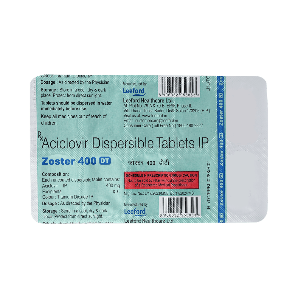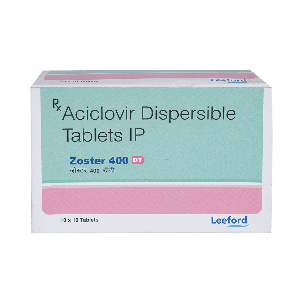 ZosTER 400mg Tablet DT is an antiviral medicine. It helps in treating viral infections like herpes labialis, herpes simplex, shingles, genital herpes infection, and chickenpox. It prevents the multiplication of virus in human cells and therefore helps in clearing the infection. ZosTER 400mg Tablet DT should be taken in the dose and duration as advised by your doctor. Do not skip any doses and finish the full course of treatment even if you feel better. Dissolve it in a glass of water before taking it. It may be taken with or without food, but it is better to take it at a fixed time. If you miss a dose, take it as soon as possible. However, if it is almost time for your next dose, skip the missed dose and go back to your regular schedule. Do not double the dose. You should drink plenty of water while on treatment with this medicine as it helps to prevent dehydration and kidney damage.Some side effects of this medicine include headache, dizziness, vomiting, nausea, fatigue, and fever. Inform your doctor if these side effects do not resolve or persist for a longer duration. Please consult your doctor if you are pregnant, planning to conceive or breastfeeding.