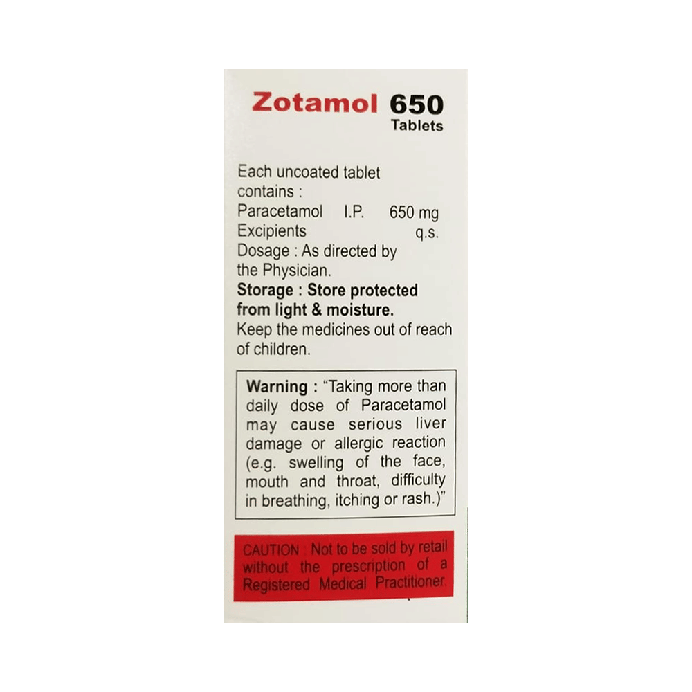 In Pain reliefZotamol 650 Tablet is a common painkiller for treating aches and pains. It is widely used and rarely causes any side effects if taken properly. To get the most benefits, take it as prescribed. Do not take more or for longer than needed as that can be dangerous.In Treatment of FeverZotamol 650 Tablet is also used to reduce a high temperature (fever). It works by blocking the release of certain chemical messengers that cause fever. It may be prescribed alone or in combination with other medicines. Take it as prescribed by the doctor.show moreshow less