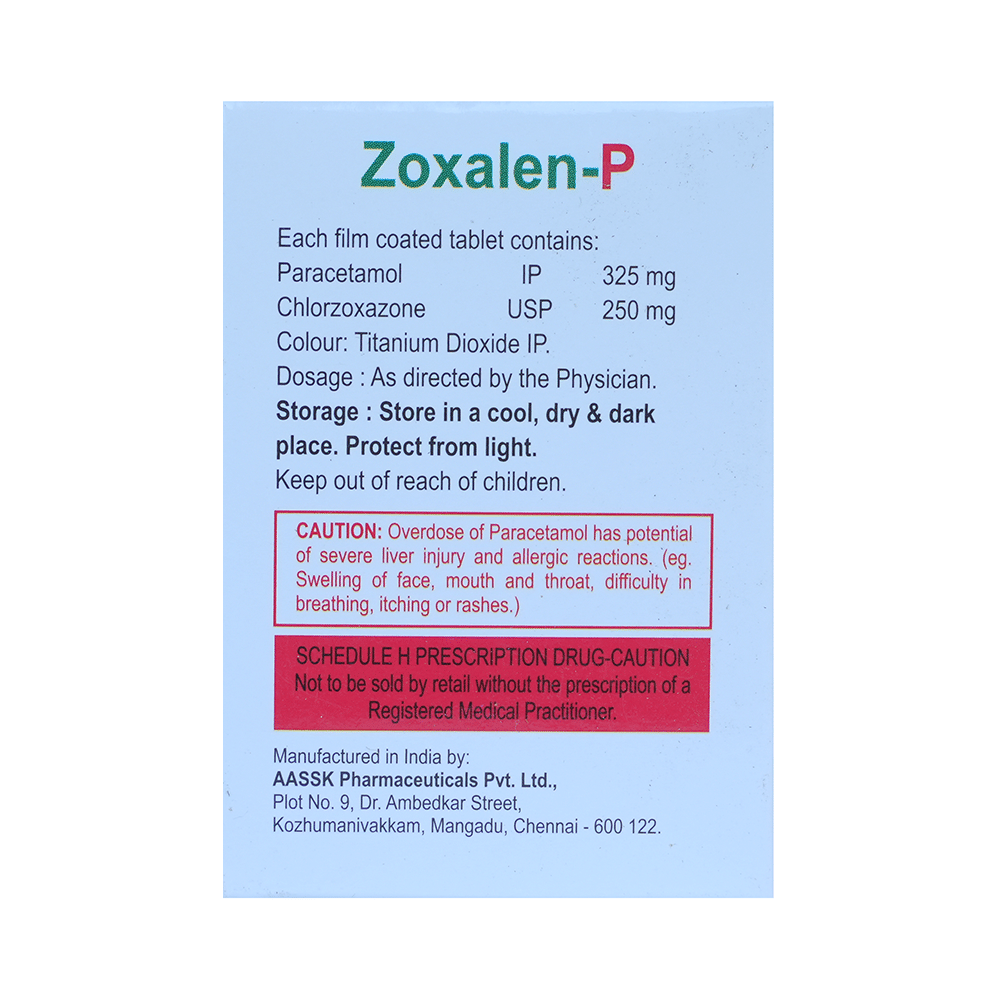 Zoxalen-P Tablet is a combination of two medicines used in the treatment of pain due to muscle spasms. It improves the movement of muscles and provides relief from pain and discomfort associated with muscle spasms. Zoxalen-P Tablet may be taken with or without food. You should take it regularly as advised by your doctor. Do not take more or use it for a longer duration than recommended by your doctor.Using this medicine can cause some common side effects such as stomach upset, dizziness, weakness, and sleepiness. If any of these side effects bother you or do not go away with time, you should let your doctor know. Your doctor may help with ways to reduce or prevent these side effects.The medicine may not be suitable for everybody. Before taking it, let your doctor know if you have any problems with your heart, kidneys, or liver. To make sure it is safe for you, let your doctor also know all the other medicines you are taking. Pregnant and breastfeeding mothers should first consult their doctors before using the medicine.