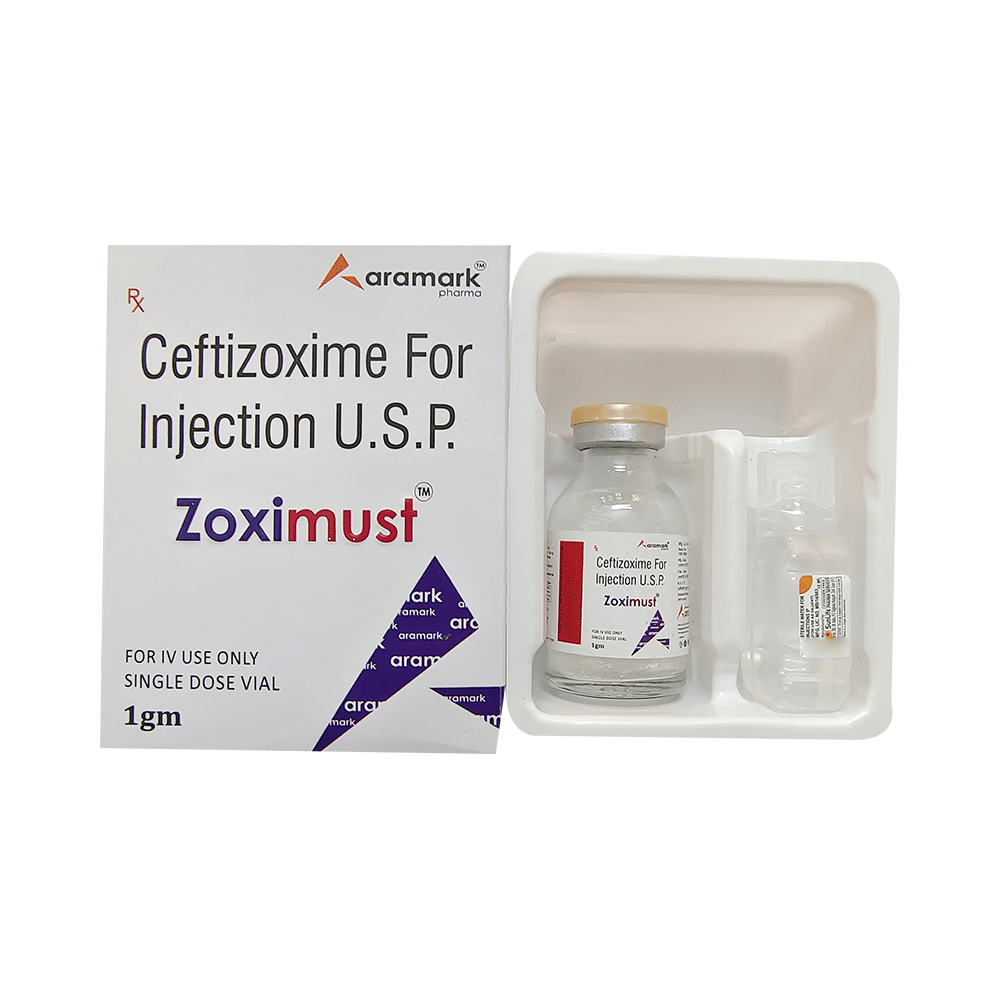 Zoximust Injection is an antibiotic medicine used to treat bacterial infections in your body. It is effective in infections of the brain, lungs, ear, urinary tract, skin and soft tissues, bones and joints, blood, and heart. It is also used to prevent infections during surgery. Zoximust Injection fights and stops the growth of many types of bacteria. This helps to improve your symptoms and cure the underlying infection. It is given as a drip (intravenous infusion) or as an injection directly into a vein or a muscle under the supervision of a healthcare professional. Your doctor will decide the correct dose for you. You should use this medicine regularly at evenly spaced intervals as per the schedule prescribed by your doctor. Do not skip any doses and finish the full course of treatment even if you feel better. Stopping the medicine too early may lead to the infection returning or worsening. The most common side effects of this medicine include nausea, vomiting, and diarrhea. Some people may develop temporary redness or pain at the site of injection. These side effects are usually mild but let your doctor know if they bother you or last more than a few days. Before using it, you should tell your doctor if you are allergic to any antibiotics, and if you have any liver or kidney problems. You should also let your healthcare team know all other medicines you are taking as they may affect, or be affected by this medicine. Pregnant and breastfeeding mothers should consult their doctor before using it.