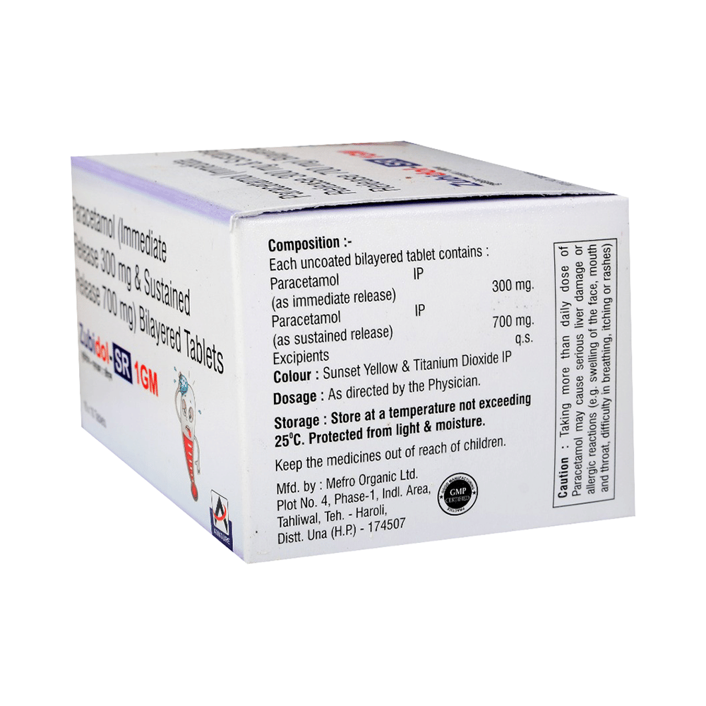 Zubidol-SR 1GM Tablet is a medicine used in the treatment of pain and fever. It may also be used to treat many conditions such as headache, body ache, period pain, toothache, and cold. It blocks the release of certain chemical messengers that cause pain, inflammation, and fever. You should take Zubidol-SR 1GM Tablet regularly as advised by your doctor. It is usually best taken with food otherwise it may upset your stomach. Do not take more or use it for longer than recommended.Side effects are rare if this medicine is used correctly but this medicine may cause stomach pain, nausea, and vomiting in some people. Consult your doctor if any of these side effects bother you or do not go away.Before taking it, let your doctor know if you have liver or kidney problems or are using blood-thinning medicines. It may affect the dose or suitability of this medicine. Let your doctor know about all the other medicines you are taking because they may affect, or be affected by, this medicine. Pregnant or breastfeeding women should consult their doctor before taking this medicine. It is best to avoid drinking alcohol while using this medicine.