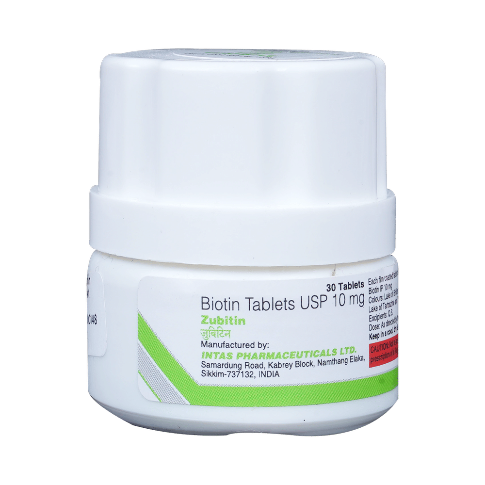 In Treatment of Nutritional deficienciesZubitin Tablet is a supplement of vitamin B7 that is essential for breaking down of carbohydrates, fats, and other substances in the body. It is commonly used for various conditions such as hair loss, and brittle nails. Take it in the exact dose and duration as prescribed by your doctor for maximum benefits.
