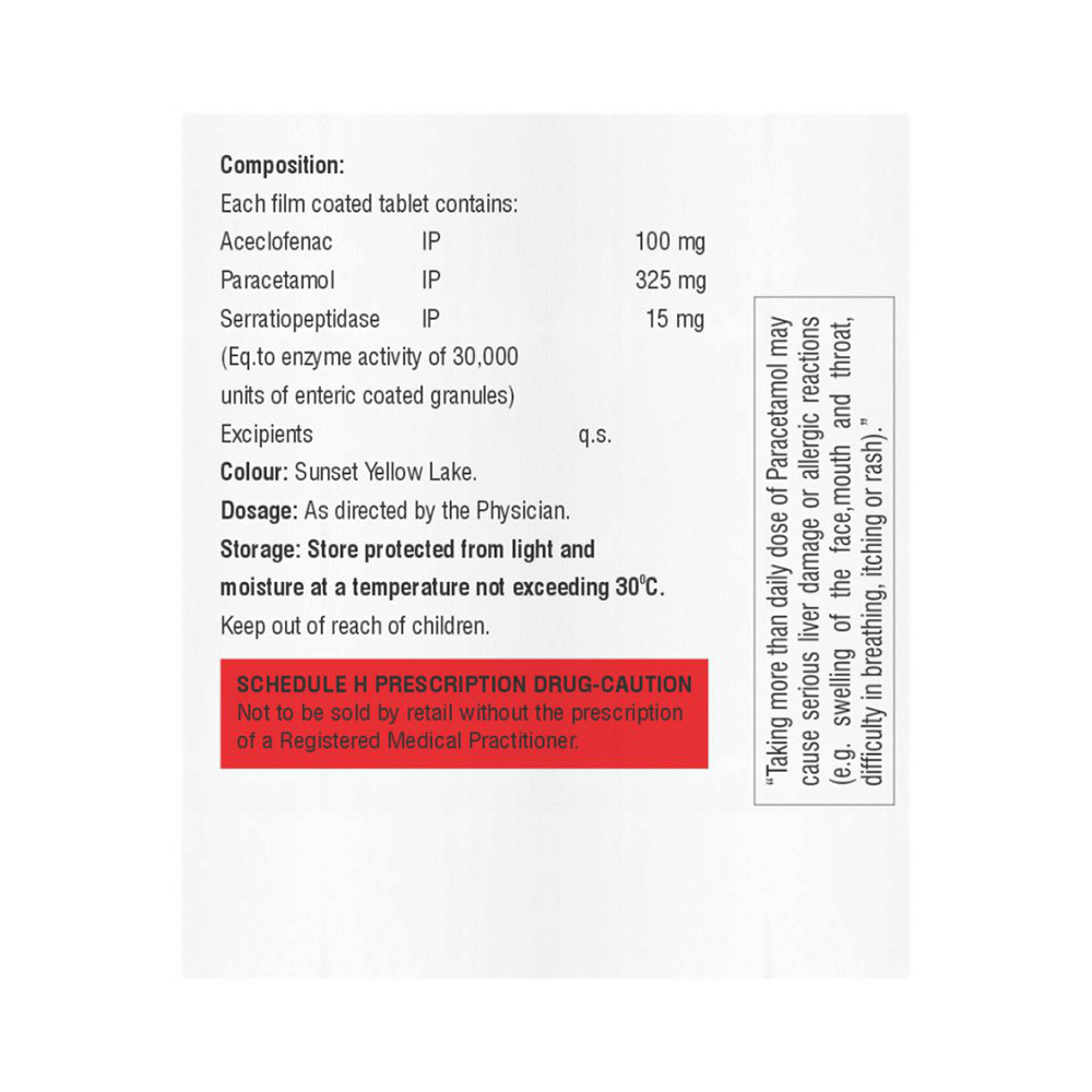 Salt Composition: Aceclofenac (100mg) + Paracetamol (325mg) + Serratiopeptidase (15mg)