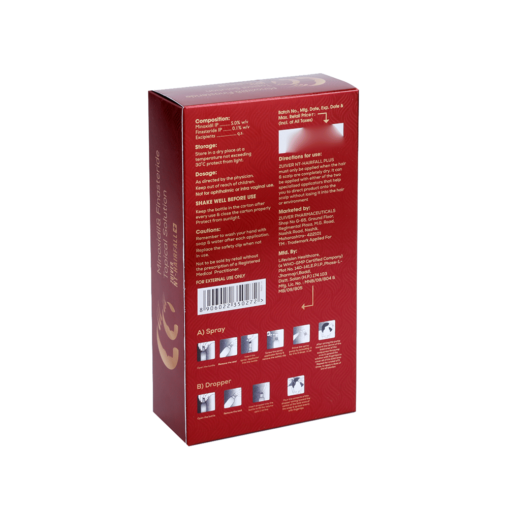Zuiver Hair Regrowth + Solution Alcohol Free is a combination medicine used in the treatment of hair loss in men. It works by increasing blood flow to the hair follicles, which further prevents hair loss and stimulates re-growth, resulting in longer, thicker, and increased numbers of hair. Use Zuiver Hair Regrowth + Solution Alcohol Free in the dose and duration as prescribed by your doctor or as instructed on the label. Clean and dry your scalp before using it. It may take several months before you notice any hair growth. The first growth could be soft, colorless, and barely visible. Use it in the exact dose and duration as prescribed by your doctor. Using more than recommended will not speed up hair growth and may increase the likelihood of side effects. Use it for as long as the doctor has prescribed to maintain proper hair growth. If your condition does not improve after using it for 4 to 6 months, tell your doctor. This medicine is to be used only by men and is not indicated in women.Common side effects of this medicine include application site reactions, dry skin, impotence, decreased libido, ejaculation disorders, breast enlargement, breast tenderness in males, and skin rash. In case of accidental contact with other parts of the body, it may cause excessive hair growth. If you get it in your eyes, mouth, or broken skin, rinse thoroughly with plenty of water. Talk to your doctor if you are bothered by side effects or they do not go away.To ensure its safety, before using this medicine, let your doctor know if you have any problems with your heart. Additionally, inform your doctor about all the medicines you are taking. Pregnant, potentially pregnant, or breastfeeding women should not handle this medicine because of the possibility of absorption of finasteride. As it may cause potential harm to a male baby or fetus.