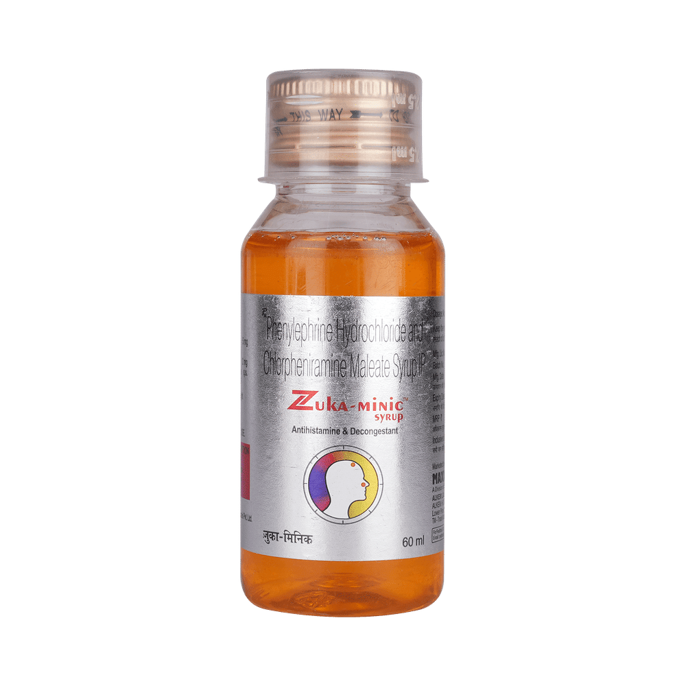 Zuka-Minic Syrup is a combination medicine used for the symptomatic treatment of common cold in children. It helps relieve discomfort caused by a runny nose, blocked nose, and sneezing, allowing the child to breathe more easily and feel better. Zuka-Minic Syrup may be given to your child with or without food. Always follow the exact dose and duration prescribed by the doctor. The dosage will depend on your child’s age, weight, and the severity of symptoms. Do not stop the medicine early, even if your child seems to be feeling better, unless advised by the doctor.Common side effects may include nausea, vomiting, or headache. These are usually mild and temporary. However, if you notice anything unusual or are concerned about how your child is responding to the medicine, consult your doctor promptly. This medicine may also cause drowsiness, so avoid engaging your child in activities that require alertness until you know how it affects them.Make sure your child stays well hydrated while taking Zuka-Minic Syrup. Inform your doctor if your child has any history of liver or kidney problems, as the dose may need to be adjusted accordingly.Note: As per the Ministry of Health and Family Welfare, Zuka-Minic Syrup should not be used in children below 4 years of age.