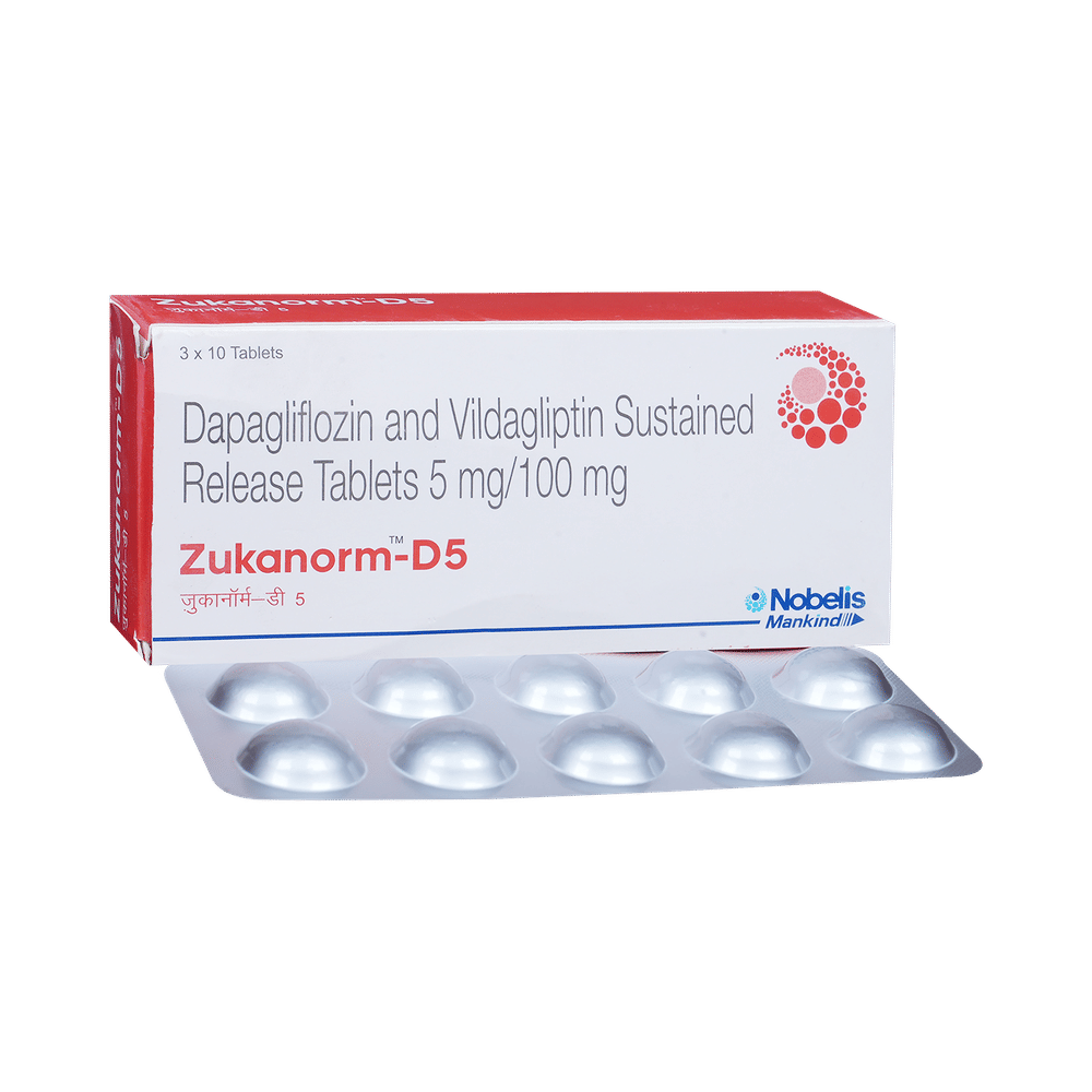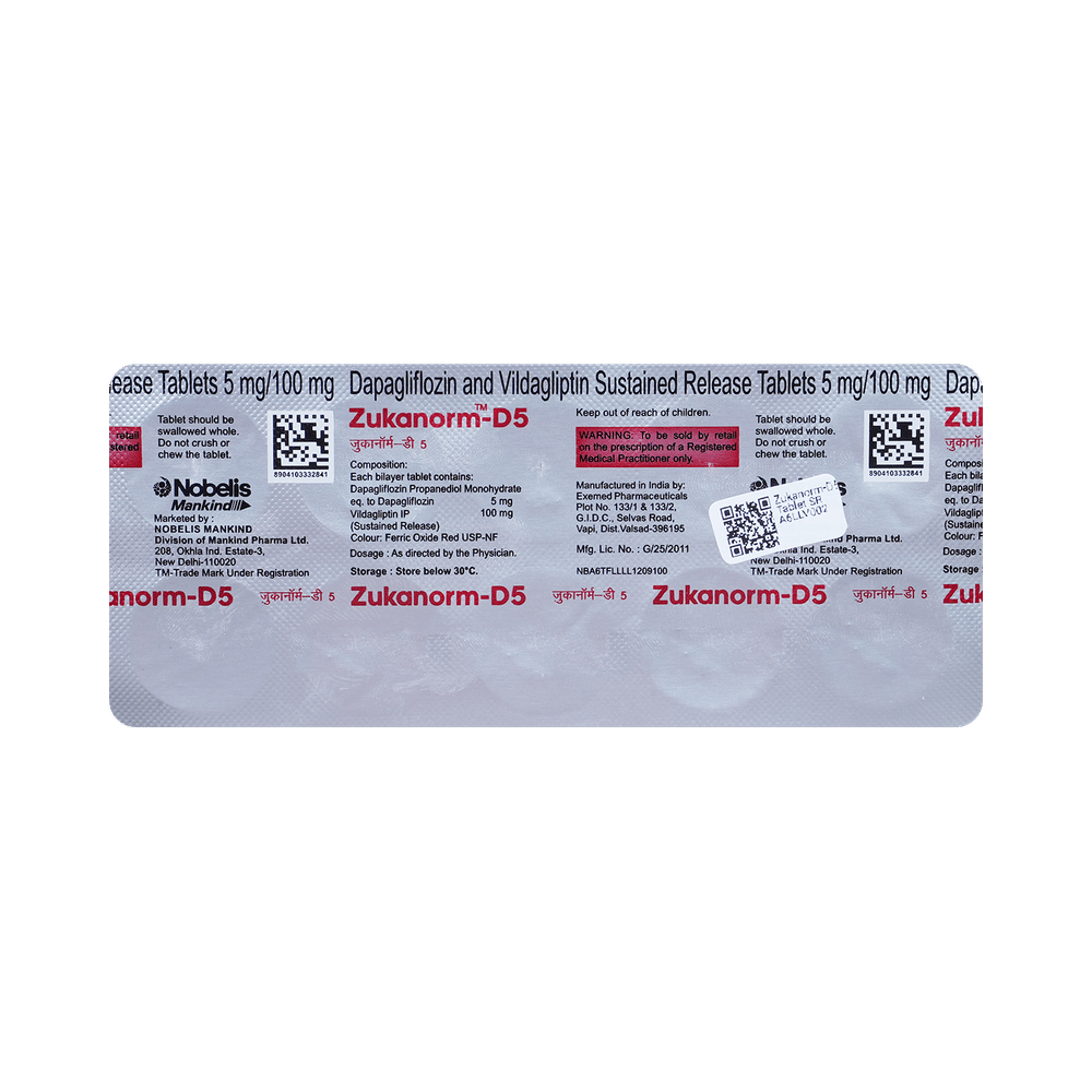Zukanorm-D5 Tablet SR is a combination of two antidiabetic medications. Dapagliflozin increases urinary glucose excretion and reduces blood glucose levels. Vildagliptin reduces the amount of glucose produced by the liver, by raising insulin levels and decreasing the levels of the glucagon (the hormone that increases blood glucose level).