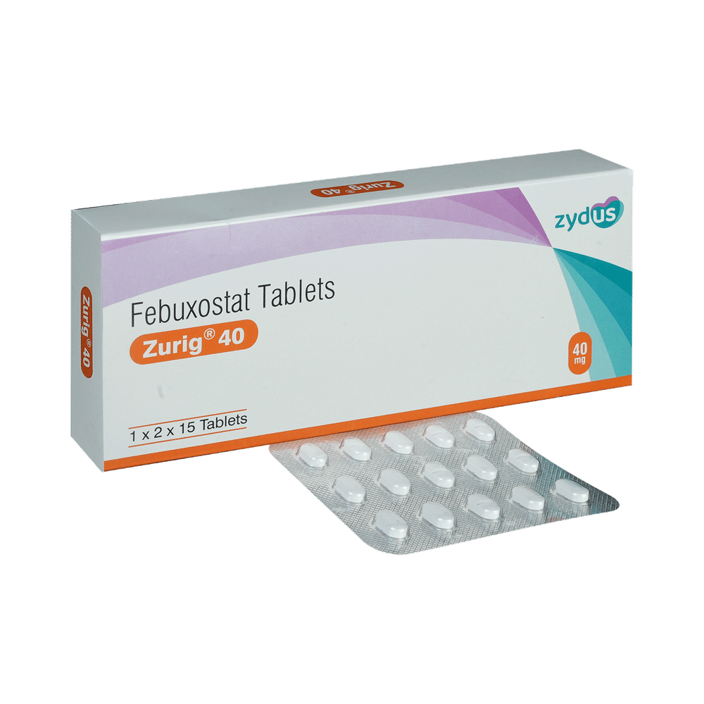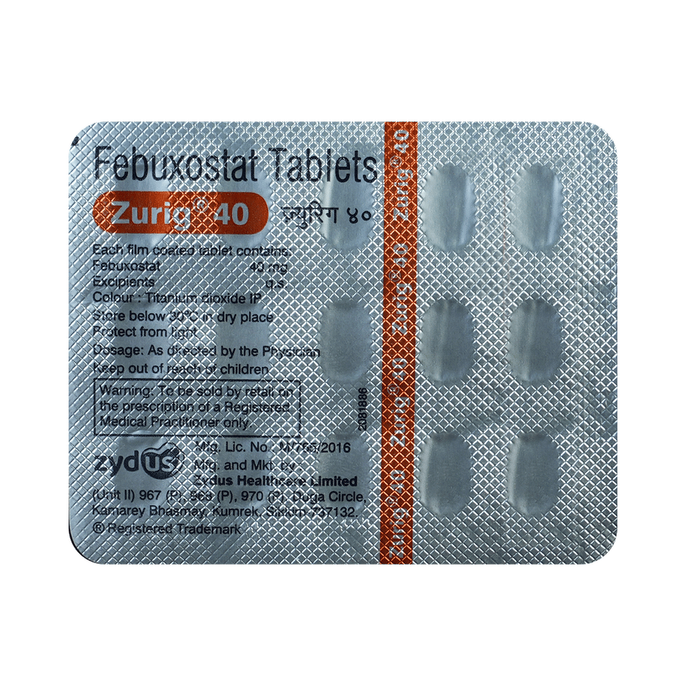 Zurig 40 Tablet is a medicine used to treat and prevent gout. Gout happens when there is too much uric acid in your body and it forms into crystals that can appear around your joints leading to painful and swollen joints. This medicine helps to keep uric acid levels low. Zurig 40 Tablet can be taken with or without food. You should keep taking it as recommended by your doctor even when you are not having a gout attack. If you stop, your symptoms may get worse because of the formation of more crystals in your joints. You can help yourself by making some changes to your diet (eg. avoiding alcohol and non-vegetarian foods) and drinking plenty of fluids.Some of the common side effects of this medicine are liver function abnormalities, nausea, joint pain, and rashes. You may experience a temporary increase in the gout symptoms (rapid onset of severe pain, warmth, and redness in the joint) when you first start taking the medicine. However, do not stop taking the medicine. Your doctor may suggest some painkillers and additional medicines to help reduce or prevent these symptoms. Tell your doctor right away if you get any symptoms of liver disease like persistent nausea, dark urine, or yellowing of the eyes or skin.Before taking this medicine, let your doctor know if you have any heart problems, stroke, thyroid problems, or kidney or liver problems. If you are pregnant or breastfeeding, this medicine is best avoided. Check with your doctor. You will need regular blood tests while taking this medicine to check that your liver is working properly.