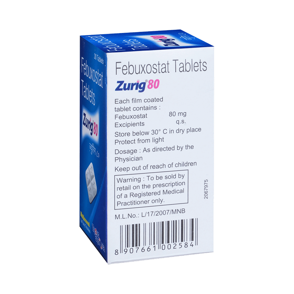 Zurig 80 Tablet is a medicine used to treat and prevent gout. Gout happens when there is too much uric acid in your body and it forms into crystals that can appear around your joints leading to painful and swollen joints. This medicine helps to keep uric acid levels low. Zurig 80 Tablet can be taken with or without food. You should keep taking it as recommended by your doctor even when you are not having a gout attack. If you stop, your symptoms may get worse because of the formation of more crystals in your joints. You can help yourself by making some changes to your diet (eg. avoiding alcohol and non-vegetarian foods) and drinking plenty of fluids.Some of the common side effects of this medicine are liver function abnormalities, nausea, joint pain, and rashes. You may experience a temporary increase in the gout symptoms (rapid onset of severe pain, warmth, and redness in the joint) when you first start taking the medicine. However, do not stop taking the medicine. Your doctor may suggest some painkillers and additional medicines to help reduce or prevent these symptoms. Tell your doctor right away if you get any symptoms of liver disease like persistent nausea, dark urine, or yellowing of the eyes or skin.Before taking this medicine, let your doctor know if you have any heart problems, stroke, thyroid problems, or kidney or liver problems. If you are pregnant or breastfeeding, this medicine is best avoided. Check with your doctor. You will need regular blood tests while taking this medicine to check that your liver is working properly.