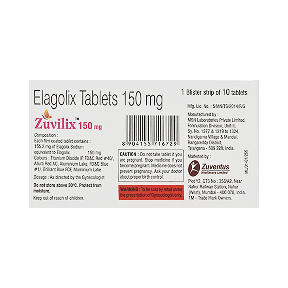 Zuvilix 150 Tablet is a prescription medicine used to manage moderate to severe pain caused by endometriosis. It works by inhibiting hormone levels that affect the growth of endometrial tissue. By reducing these hormone levels, Zuvilix 150 Tablet helps provide relief from pain and discomfort associated with the condition. Zuvilix 150 Tablet is used during techniques in women that help them in getting pregnant