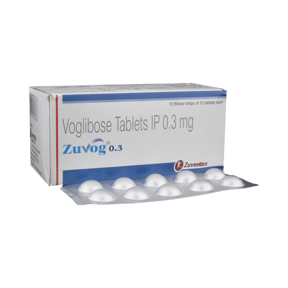 Zuvog 0.3 Tablet is a medicine used to treat type 2 diabetes mellitus. It helps control the high blood sugar levels in your body after each meal. It is used when other similar medicines along with a restricted diet, are unable to control abnormally high blood sugar levels. Zuvog 0.3 Tablet should be taken just before a meal. The dose and how often you need it will be decided by your doctor so that you get the right amount to control your blood sugar levels. Do not stop taking it suddenly without consulting your doctor. If you do, your blood sugar levels may increase and put you at risk of serious complications like kidney damage and blindness.This medicine is only part of a treatment program that should also include a healthy diet, regular exercise, and weight reduction as advised by your doctor. Monitor your blood sugar levels regularly while taking this medicine.The most common side effects of Zuvog 0.3 Tablet include flatulence (gas), stomach pain, loss of appetite, constipation, and diarrhea. Consult your doctor if any of these side effects bother you or do not go away. This medicine by itself does not cause hypoglycemia (low blood sugar levels). However, when used in combination with other diabetes medicines (especially insulin or sulphonylureas), it can lead to hypoglycemia (low blood sugar levels). Such episodes of hypoglycemia will have to be treated by taking plain glucose. Table sugar or common sugar will not help correct low blood sugar levels if you are taking this medicine.Before taking it, let your doctor know if you have any kidney or liver problems. Do not take this medicine if you have ulceration or inflammation in the bowel (eg. ulcerative colitis or Crohn’s disease). Pregnant or breastfeeding women should also consult their doctor before taking it. Please tell your doctor about all the other medicines you are taking to make sure you are safe. Avoid excessive alcohol intake while taking this medicine as it may increase the risk of hypoglycemia (low blood sugar levels).