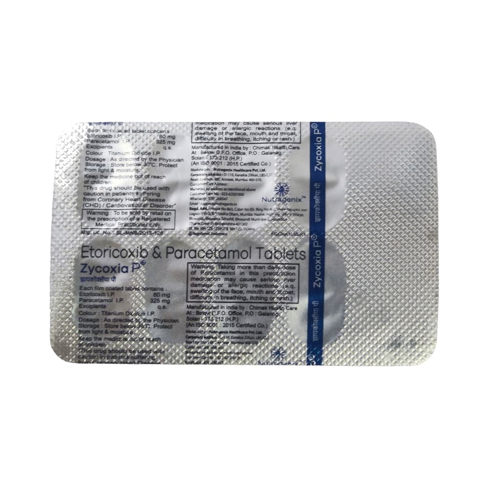 Zycoxia P 60mg/325mg Tablet is a combination of two medicines: Etoricoxib and Paracetamol. Etoricoxib is a non-steroidal anti-inflammatory drug (NSAID) and Paracetamol is an antipyretic (fever reducer). They work by blocking the release of certain chemical messengers in the brain that cause pain and fever.