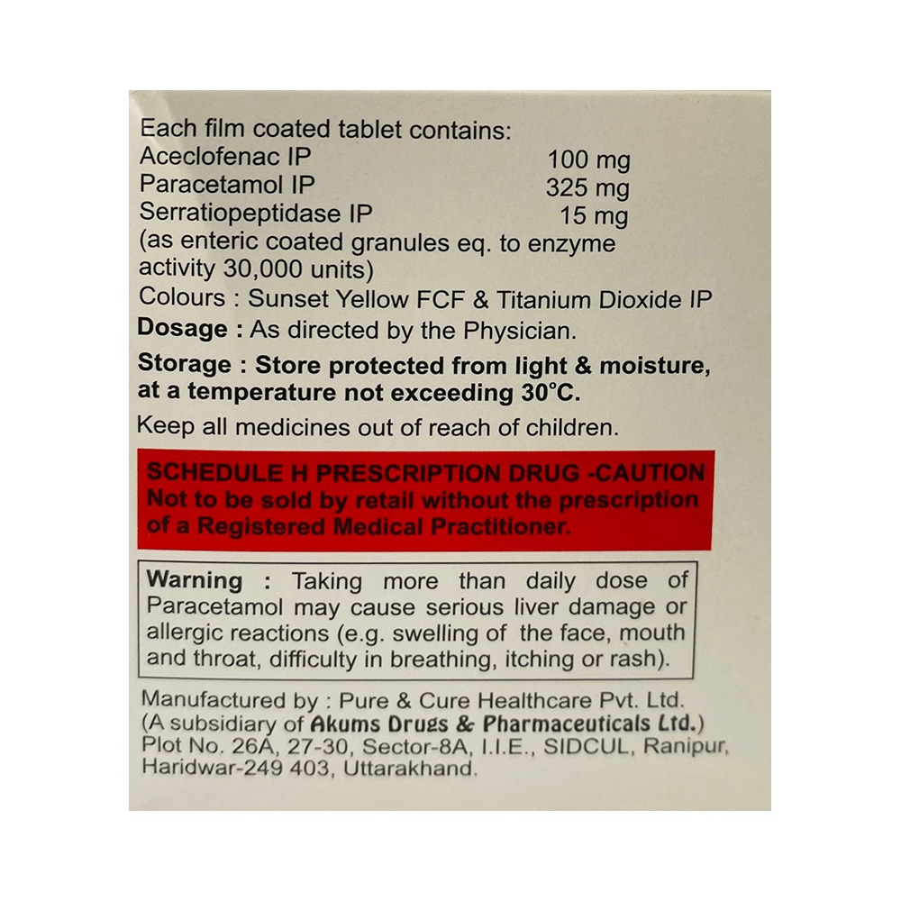 Salt Composition: Aceclofenac (100mg) + Paracetamol (325mg) + Serratiopeptidase (15mg)