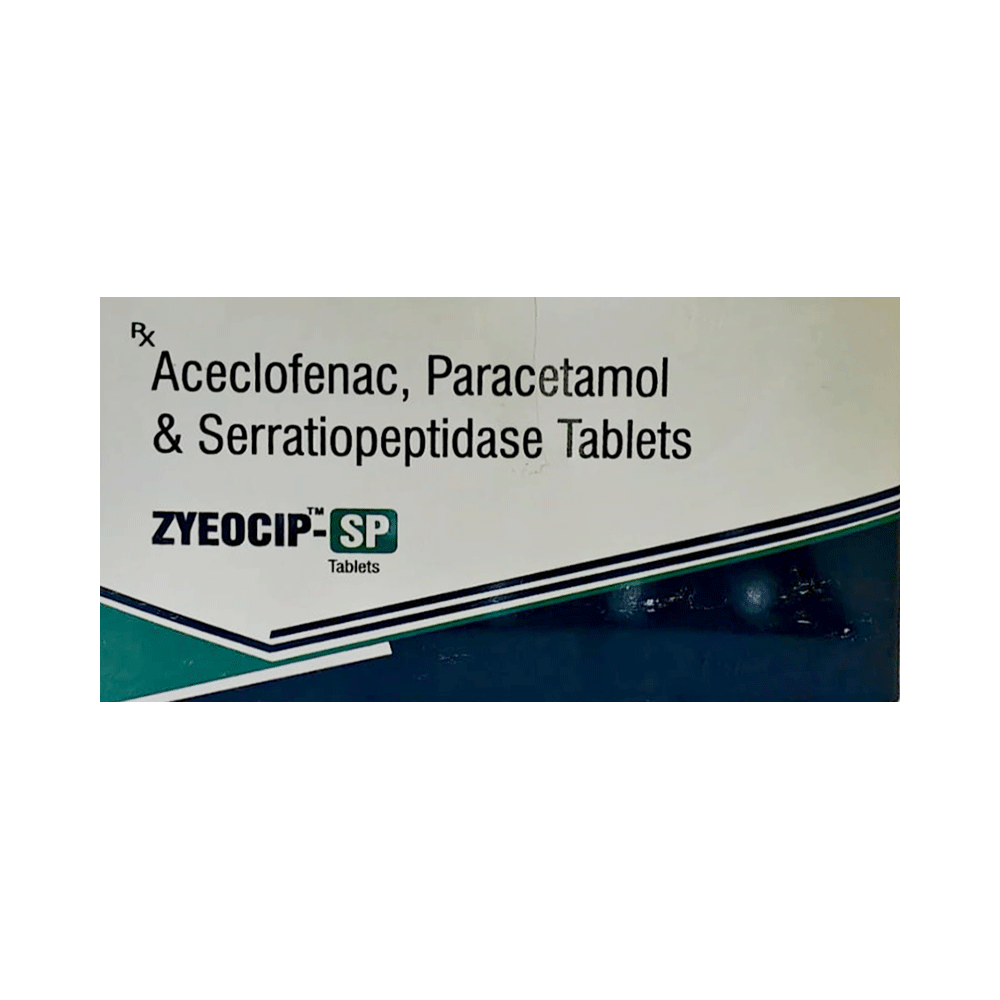 Zyeocip-SP Tablet is a combination of three medicines: Aceclofenac, Paracetamol and Serratiopeptidase. Aceclofenac is a non-steroidal anti-inflammatory drug (NSAID), and Paracetamol is an antipyretic (fever reducer). They work by blocking the release of certain chemical messengers in the brain that cause pain and fever. Serratiopeptidase is an enzyme which works by breaking down abnormal proteins at the site of inflammation and promotes healing.