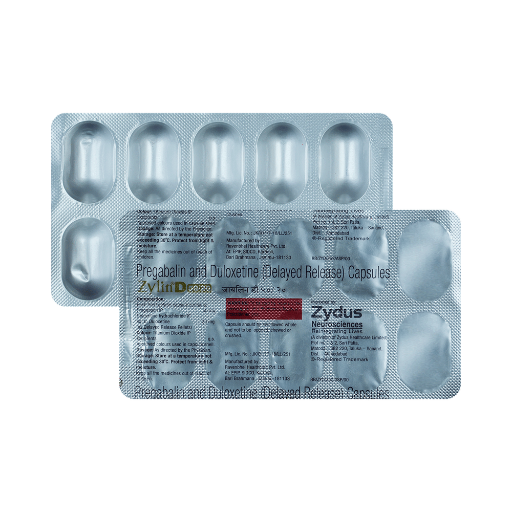 Zylin D 50/20 Capsule DR is a combination of two medicines: pregabalin and duloxetine. Pregabalin decreases neurotransmitter release, while duloxetine boosts serotonin and norepinephrine levels to modulate pain perception, working together to relieve nerve pain.