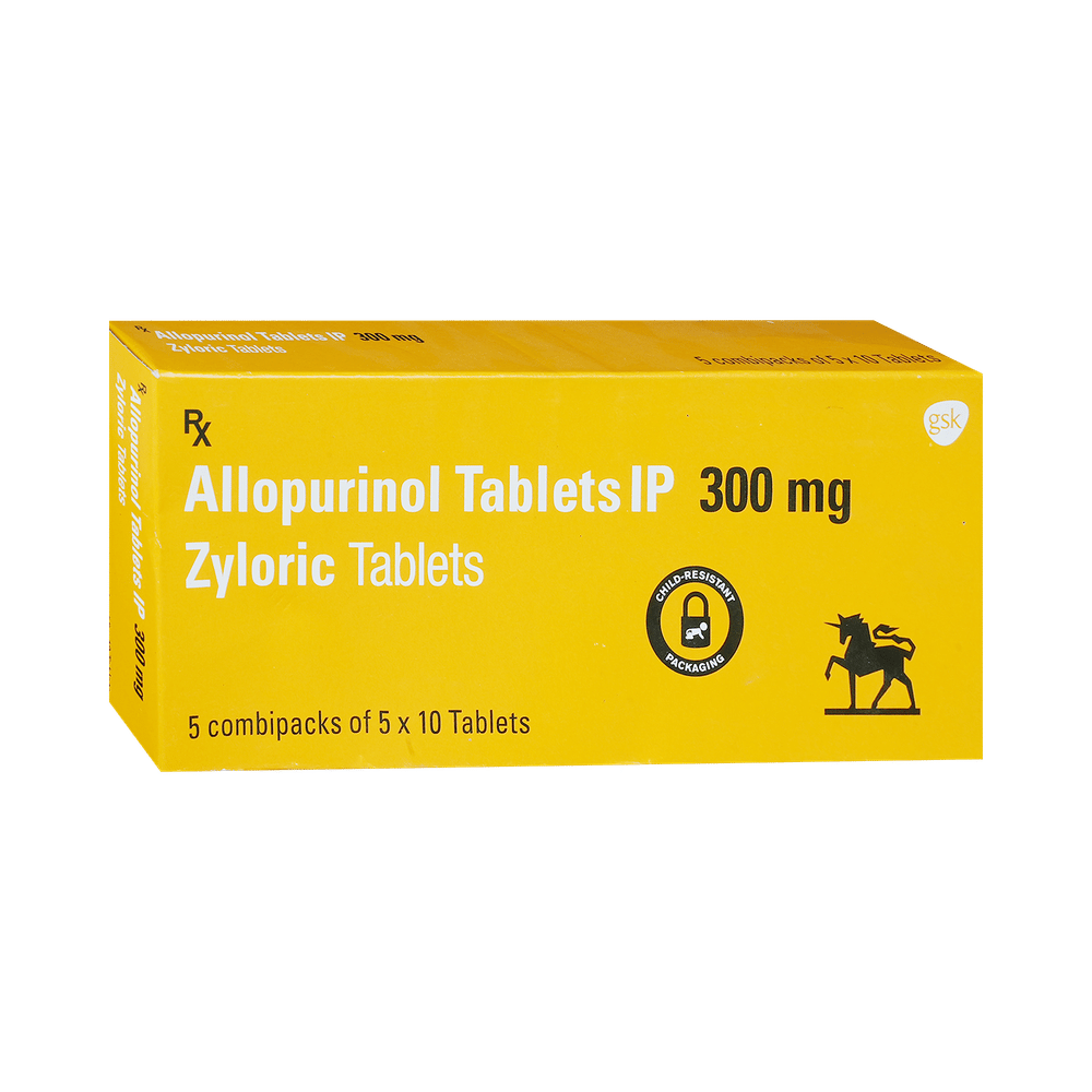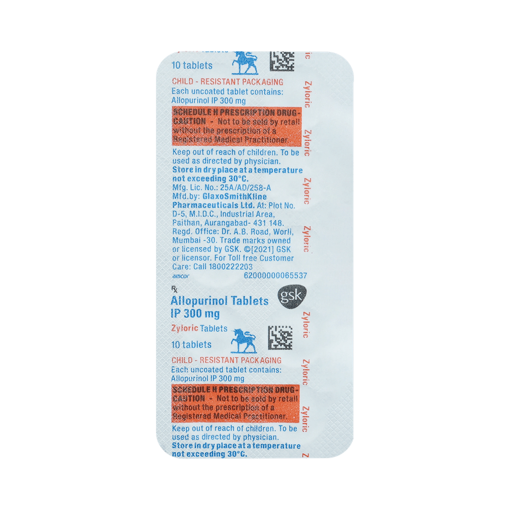 Zyloric 300 Tablet is a medicine used to treat and prevent gout. Gout happens when there is too much uric acid in your body, and it forms crystals that can appear around your joints and kidneys and cause pain. This medicine helps to keep uric acid levels low. Zyloric 300 Tablet should be taken with food. You should keep taking it as recommended by your doctor, even when you are not having a gout attack. If you stop, your symptoms may get worse because more crystals form in your joints and kidneys. You can help yourself by making some changes to your diet and drinking plenty of fluids.Some of the common side effects of this medicine are diarrhea and increased liver enzymes. Your doctor may help with ways to reduce or prevent these symptoms. Some people may get a severe allergic reaction that needs urgent medical attention. Talk to your doctor straight away if you get symptoms of liver disease, including nausea that does not stop, yellowing skin or eyes, or dark urine.To make sure it is safe for you, before taking this medicine, let your doctor know if you have or have had heart failure, heart problems, stroke, kidney or liver disease, or thyroid problems. Do not use this medicine if you are pregnant or breastfeeding. Check with your doctor. You will be asked for regular blood tests to check that your liver is working properly.