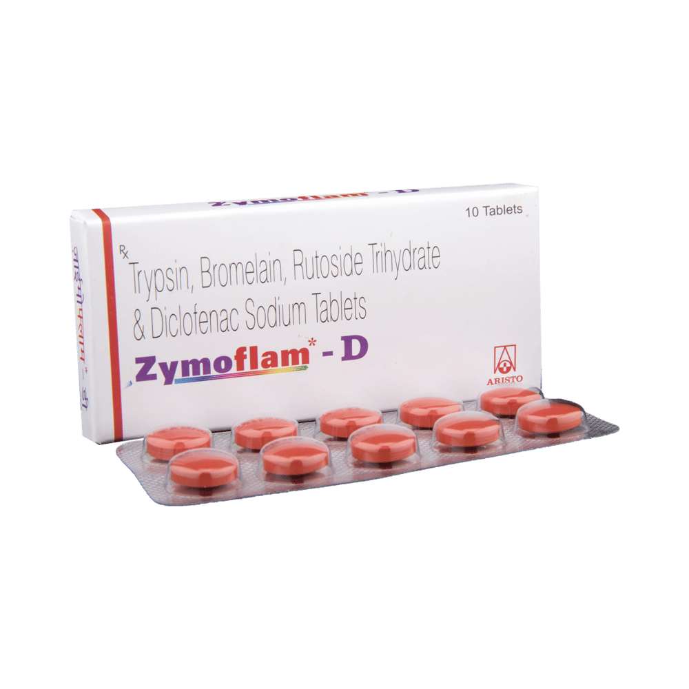 Zymoflam D Tablet is a combination of four medicines: Trypsin, Bromelain, Rutoside and Diclofenac. Trypsin and Bromelain are enzymes. They increase blood supply and make the body produce substances that fight pain and swelling. Rutoside is an antioxidant which protects the body from damage by chemicals (free radicals) and further reduces swelling. Diclofenac is a non-steroidal antiinflammatory drug (NSAID) which works by blocking the release of certain chemical messengers (prostaglandins) in the brain that cause pain and inflammation (redness and swelling).