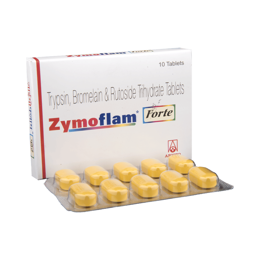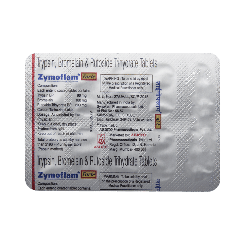 Zymoflam Forte Tablet is a combination of two enzymes (Bromelain, Trypsin) and an antioxidant (Rutoside). The enzymes work by increasing the blood supply to the affected area and helping the body produce substances that fight pain and swelling. The antioxidant protects the body from damage by chemicals (free radicals) and further reduces swelling.