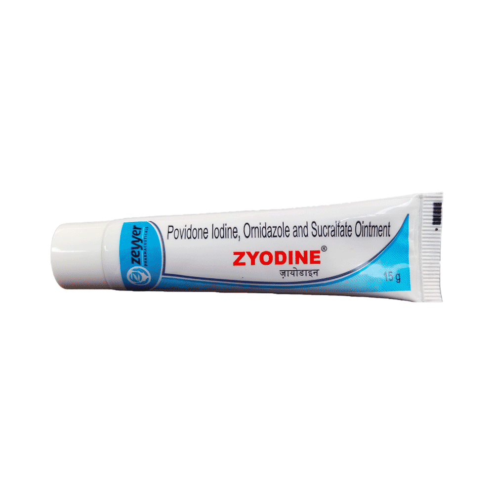 Zyodine Ointment is a combination of three medicines: Ornidazole, Povidone Iodine and Sucralfate. Ornidazole is an antibiotic. It kills the bacteria and other microorganisms that cause infections by damaging the DNA. Povidone Iodine is an antiseptic. It slowly releases iodine which kills or prevents the growth of infectious microorganisms. Sucralfate is a protectant which covers the damaged tissue and protects it against injury to facilitate healing.
