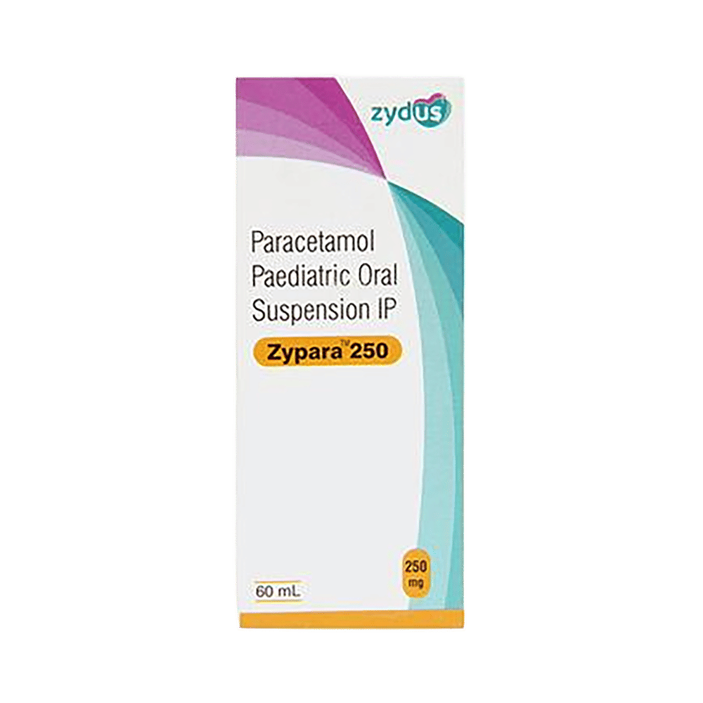Zypara 250mg Oral Suspension is a widely prescribed medicine that helps to ease pain and bring down high body temperature (fever). In children, it treats conditions like headache, toothache, body ache, fever, and common cold. Zypara 250mg Oral Suspension is given orally preferably at a fixed time every day. Though this medicine can be taken before or after food, it is best given after food as it can irritate the inner lining of an empty stomach. The dose and duration will depend upon your child’s age, body weight, and severity of the infection, so stick to the dose, time, and way prescribed by your child’s doctor. If your child vomits within 30 minutes of taking the medicine, let the child calm down and repeat the same dose. Redosing is not recommended if your child gets sick more than 30 minutes after taking a dose.Do not give your child Zypara 250mg Oral Suspension along with other medicines (many cold and flu medicines and other painkillers) that contain paracetamol, as this may result in overdosing and cause dangerous side effects such as hepatotoxicity (liver damage). Always check the ingredients of any other medicines before giving them to your child in combination with this medicine.Generally, this medicine is well-tolerated by the children. However, temporary side effects such as indigestion, nausea, vomiting, and difficulty in sleeping, may occur in some children. Consult your doctor in case these episodes become bothersome for your child.This medicine is often considered safe and effective but may not be suitable for everybody. Inform your doctor if your child is undergoing treatment for any blood-related disorder, is allergic to any medicinal compound, or has any birth defects, liver impairment, or kidney dysfunction. This will help your child’s doctor evaluate the dose and suitability of this medicine in a better way.