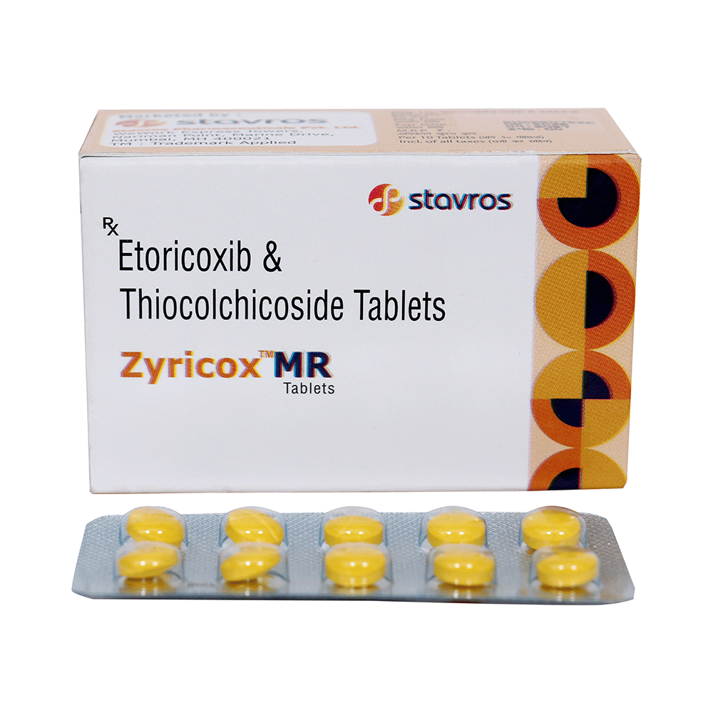 Zyricox MR Tablet is a combination of two medicines: Etoricoxib and Thiocolchicoside, which relieves pain and relaxes the muscles. Etoricoxib is a non-steroidal anti-inflammatory drug (NSAID) which works by blocking the release of certain chemical messengers that cause pain and inflammation (redness and swelling). Thiocolchicoside is a muscle relaxant. It works on the centers in the brain and spinal cord to relieve muscle stiffness or spasm and to improve pain and movement of muscles.