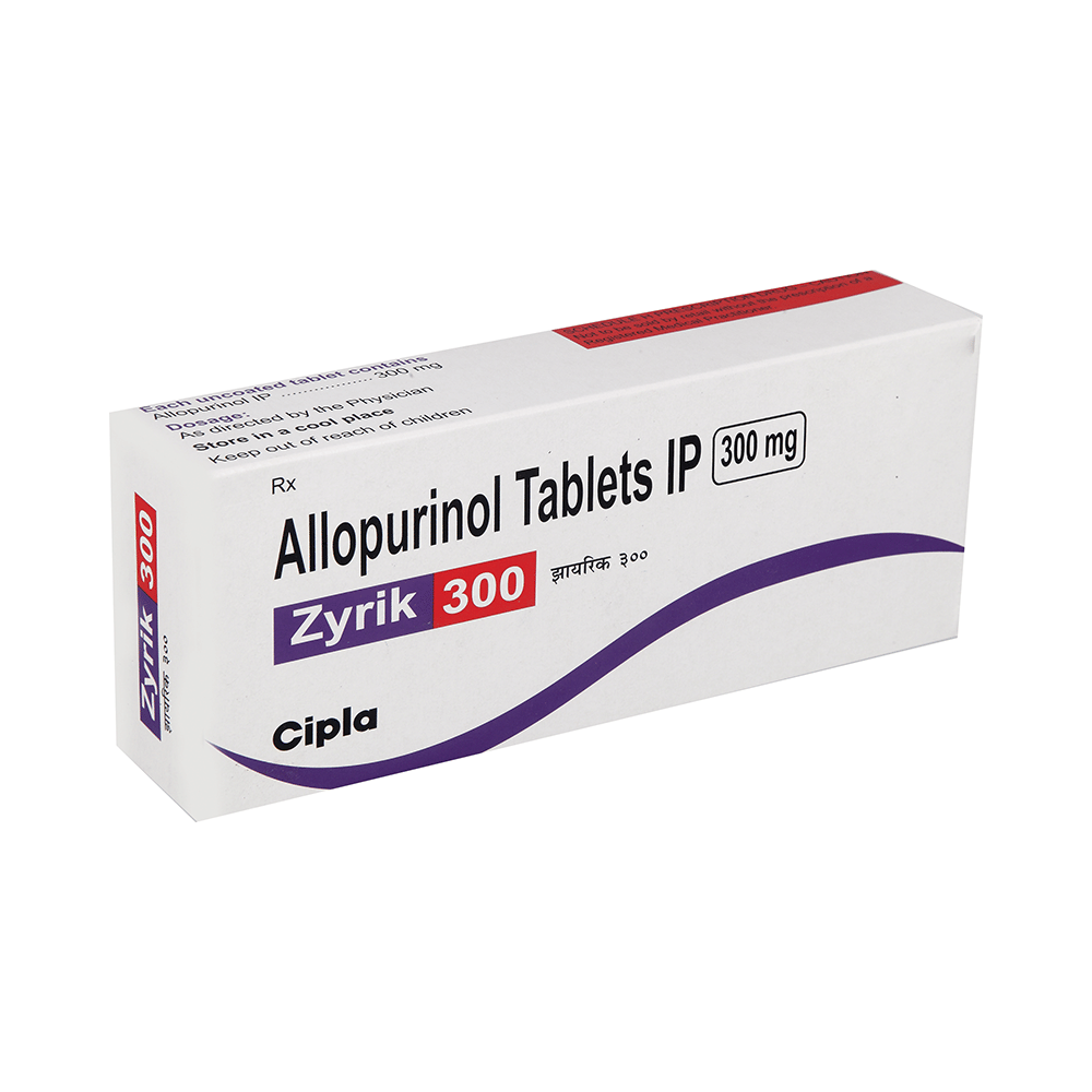 Zyrik 300 Tablet is a medicine used to treat and prevent gout. Gout happens when there is too much uric acid in your body, and it forms crystals that can appear around your joints and kidneys and cause pain. This medicine helps to keep uric acid levels low. Zyrik 300 Tablet should be taken with food. You should keep taking it as recommended by your doctor, even when you are not having a gout attack. If you stop, your symptoms may get worse because more crystals form in your joints and kidneys. You can help yourself by making some changes to your diet and drinking plenty of fluids.Some of the common side effects of this medicine are diarrhea and increased liver enzymes. Your doctor may help with ways to reduce or prevent these symptoms. Some people may get a severe allergic reaction that needs urgent medical attention. Talk to your doctor straight away if you get symptoms of liver disease, including nausea that does not stop, yellowing skin or eyes, or dark urine.To make sure it is safe for you, before taking this medicine, let your doctor know if you have or have had heart failure, heart problems, stroke, kidney or liver disease, or thyroid problems. Do not use this medicine if you are pregnant or breastfeeding. Check with your doctor. You will be asked for regular blood tests to check that your liver is working properly.