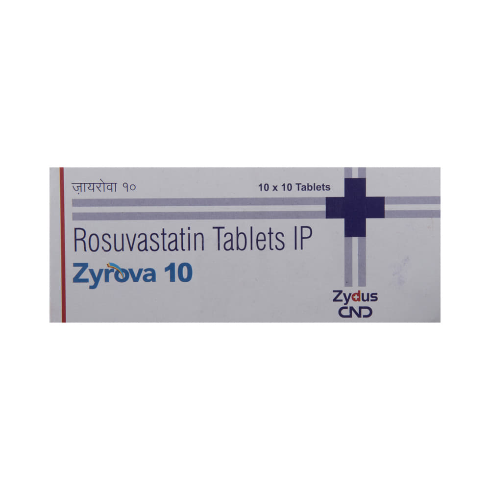 Zyrova 10 Tablet belongs to a group of medicines called statins. It is used to lower cholesterol and triglyceride levels and reduce the risk of heart disease. Cholesterol is a fatty substance that builds up in your blood vessels and causes narrowing, which may lead to a heart attack or stroke. Zyrova 10 Tablet is a widely prescribed medicine and is regarded as safe for long-term use. It can be taken with a meal or on an empty stomach. You can take it at any time of the day, but try to take it at the same time each day. Most people with high cholesterol do not feel ill. However, stopping your medicine may increase your cholesterol levels, making your condition worse and increasing your risk of heart disease and stroke.It is important to have your cholesterol levels checked regularly. This medicine is only one part of the treatment program, which should also include a healthy diet, regular exercise, smoking cessation, moderation of alcohol intake, and weight reduction. You can eat normally while taking this medicine, but try to avoid foods that are high in fat.Common side effects of this medicine include muscle pain, weakness, nausea, headache, and abdominal pain. These are usually mild and disappear after a short time. Consult your doctor if they persist or if you notice any yellowing of your eyes or get repeated or unexplained muscle pains.This medicine should not be used in conditions such as liver disease. Also, pregnant women and breastfeeding women should not take this medicine, as it may harm the developing baby. Diabetic patients should monitor their blood sugar levels while taking this medicine, as it may lead to an increase in blood sugar levels.