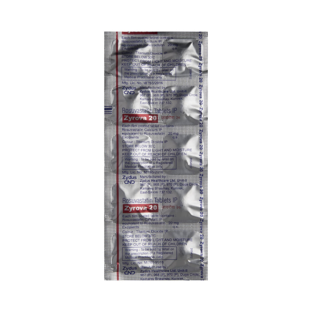 Zyrova 20 Tablet belongs to a group of medicines called statins. It is used to lower cholesterol and triglyceride levels and reduce the risk of heart disease. Cholesterol is a fatty substance that builds up in your blood vessels and causes narrowing, which may lead to a heart attack or stroke. Zyrova 20 Tablet is a widely prescribed medicine and is regarded as safe for long-term use. It can be taken with a meal or on an empty stomach. You can take it at any time of the day, but try to take it at the same time each day. Most people with high cholesterol do not feel ill. However, stopping your medicine may increase your cholesterol levels, making your condition worse and increasing your risk of heart disease and stroke.It is important to have your cholesterol levels checked regularly. This medicine is only one part of the treatment program, which should also include a healthy diet, regular exercise, smoking cessation, moderation of alcohol intake, and weight reduction. You can eat normally while taking this medicine, but try to avoid foods that are high in fat.Common side effects of this medicine include muscle pain, weakness, nausea, headache, and abdominal pain. These are usually mild and disappear after a short time. Consult your doctor if they persist or if you notice any yellowing of your eyes or get repeated or unexplained muscle pains.This medicine should not be used in conditions such as liver disease. Also, pregnant women and breastfeeding women should not take this medicine, as it may harm the developing baby. Diabetic patients should monitor their blood sugar levels while taking this medicine, as it may lead to an increase in blood sugar levels.