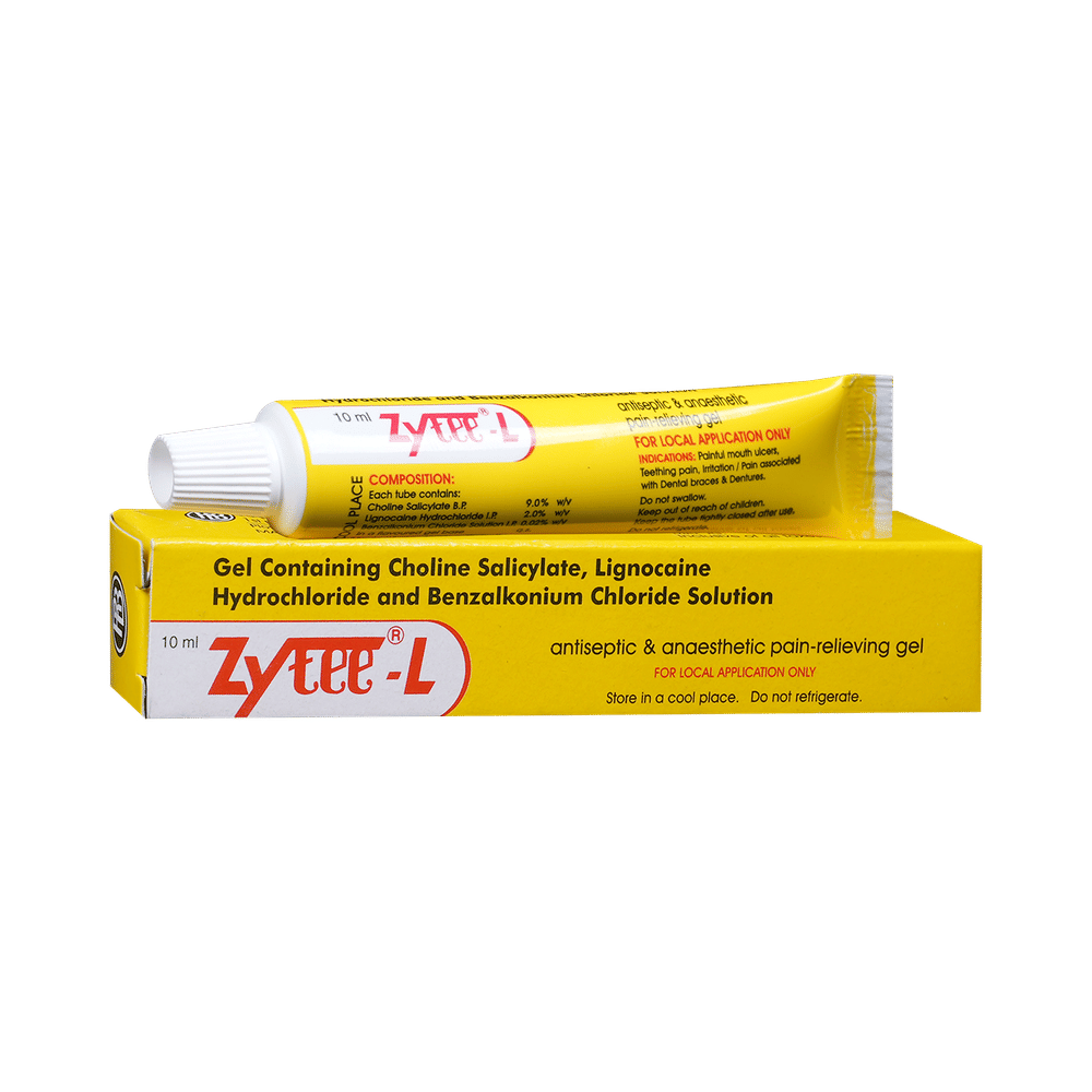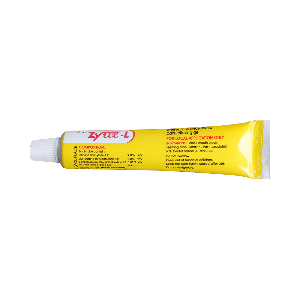 Zytee-L Gel is a combination of two medicines is used to treat mouth ulcers. It also reduces the pain, swelling, redness, and burning sensation of the ulcers. Zytee-L Gel should be used as directed by your doctor and use it in the dose and duration advised by your doctor. Apply it only in the mouth with clean hands. Do not use it more than the recommended dose.This medicine is generally safe and does not cause any side effects. However, if you experience any allergic reactions such as itching, swelling, rashes, etc., you should consult the doctor immediately.