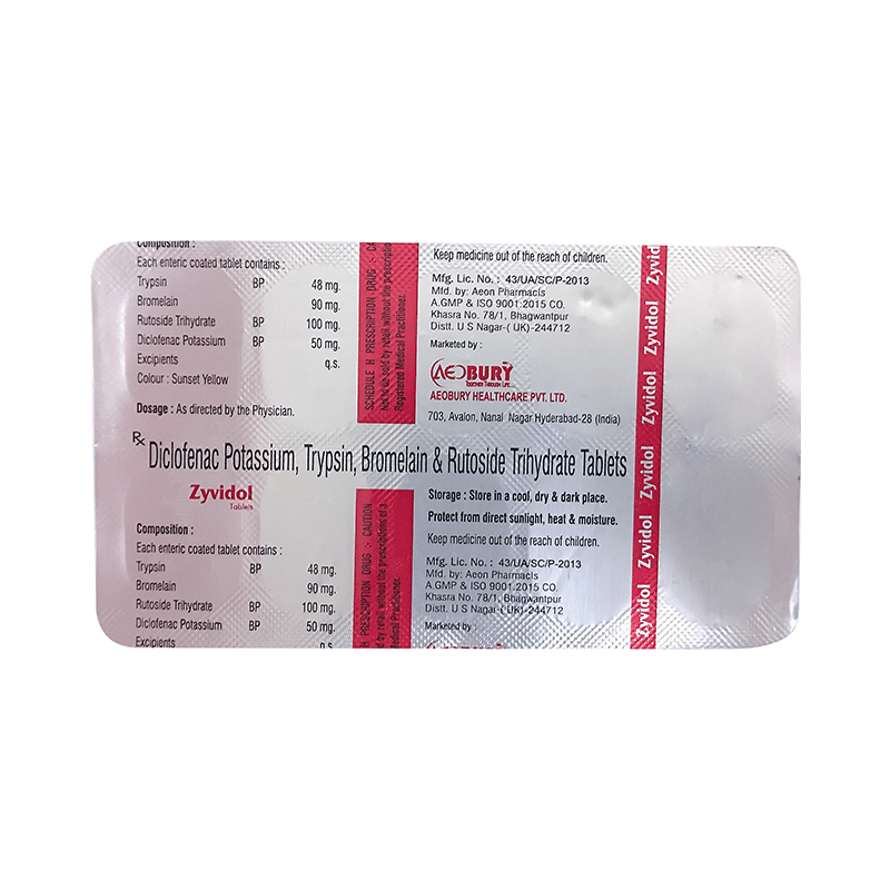 <p>Zyvidol Tablet is a combination of four medicines: Trypsin, Bromelain, Rutoside and Diclofenac. Trypsin and Bromelain are enzymes. They increase blood supply and make the body produce substances that fight pain and swelling. Rutoside is an antioxidant which protects the body from damage by chemicals (free radicals) and further reduces swelling. Diclofenac is a non-steroidal antiinflammatory drug (NSAID) which works by blocking the release of certain chemical messengers (prostaglandins) in the brain that cause pain and inflammation (redness and swelling).</p>