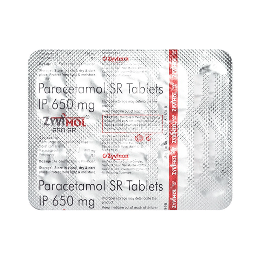 Zyvimol 650 SR Tablet helps relieve pain and fever by blocking the release of certain chemical messengers responsible for fever and pain. It is used to treat headaches, migraine, toothaches, sore throats, period (menstrual) pains, arthritis, muscle aches, and the common cold. Zyvimol 650 SR Tablet may be prescribed alone or in combination with another medicine. You should take it regularly as advised by your doctor. It is usually best taken with food otherwise it may upset your stomach. Do not take more or use it for longer than recommended.Side effects are rare if this medicine is used correctly but this medicine may cause stomach pain, nausea, and vomiting in some people. Consult your doctor if any of these side effects bother you or do not go away.This medicine is widely prescribed and considered safe but is not suitable for everybody. Before taking it, let your doctor know if you have liver or kidney problems or are using blood-thinning medicines. It may affect the dose or suitability of this medicine. Let your doctor know about all the other medicines you are taking because they may affect, or be affected by, this medicine.